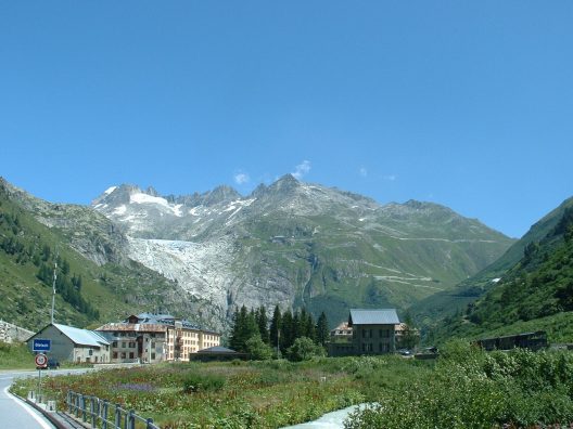 Etwas links von der Mitte das schmutzig-graue: Der Rhonegletscher.
