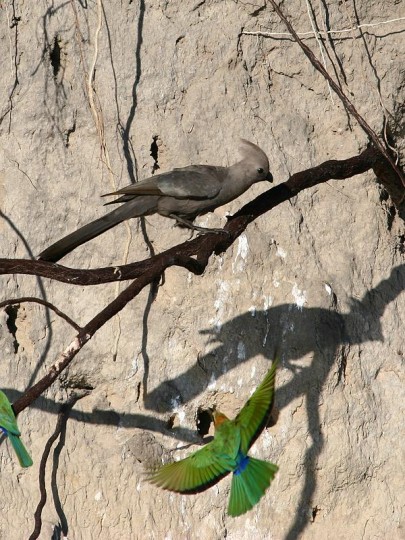 | oben: Graulärmvogel, der ruft immer Go-away! unten: Weißstirnspint im Anflug, der sich über den Nesträuber oben aufregt. | |