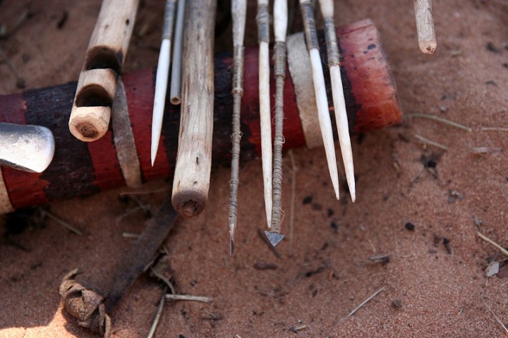 | Buschmann Werkzeug. Ein Feuerholz und Pfeile mit verschiedenen Spitzen. | |
